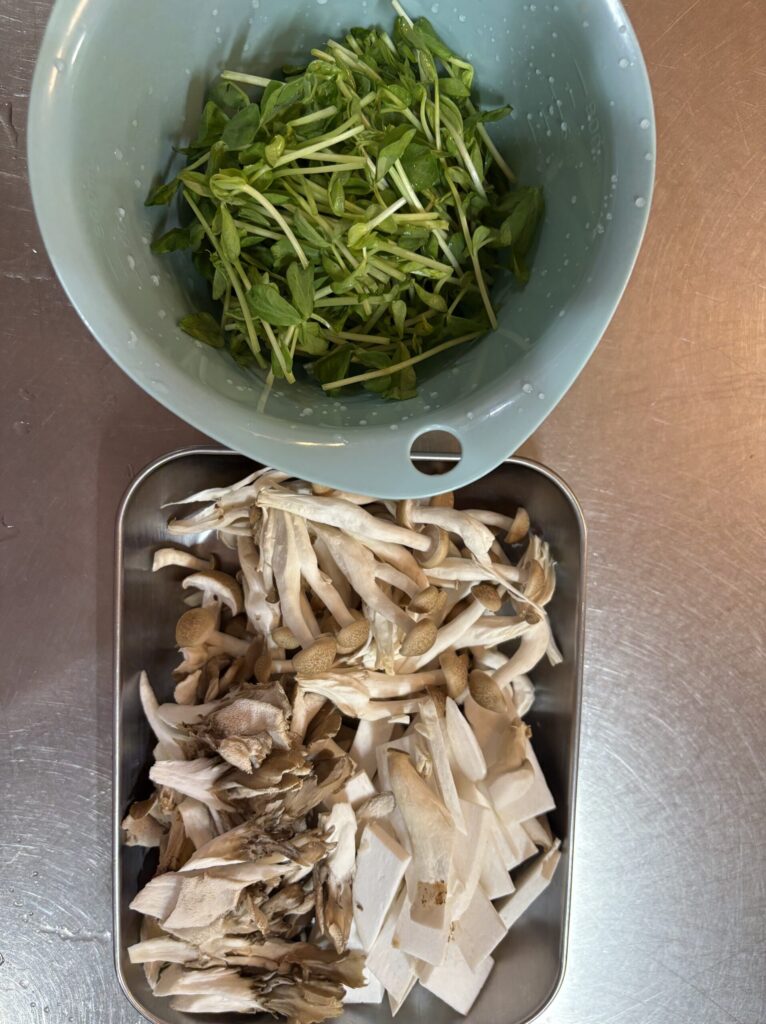 ①しめじは根本部分を切り落とし、さいておく。舞茸も食べやすい大きさにさく。エリンギは、縦半分に切ってから薄切りする。豆苗は根本から切り落とし、半分に切っておく。