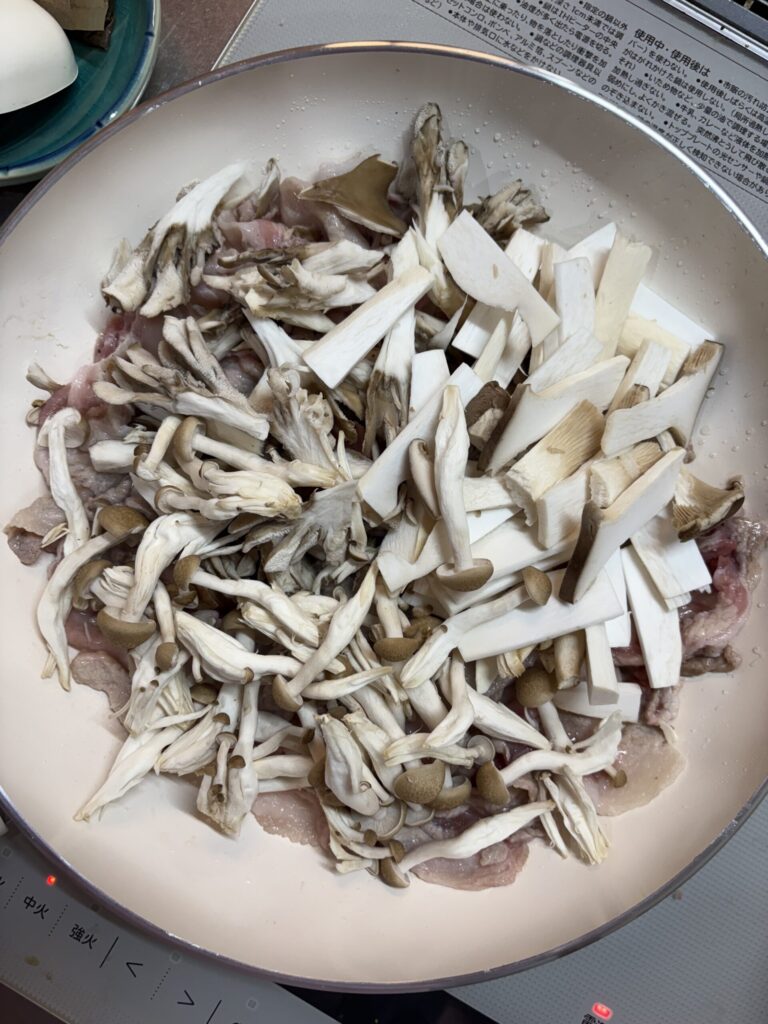 ②豚肉に片栗粉をパラパラと振りかけ、全体に馴染ませる。フライパンを熱し、油を敷いて豚肉を炒める。豚肉全体の半分くらい白っぽくなってきたら、塩コショウを少量振る。塩コショウが馴染む様に軽く炒めたらきのこを加える。