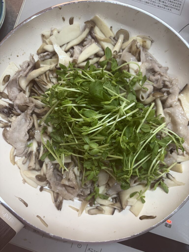 ③きのこが透き通ってくるまで炒めたら、豆苗、バター、ポン酢を加える。調味料が全体に馴染む様に炒める。豆苗が少ししんなりするくらいで火を止める。