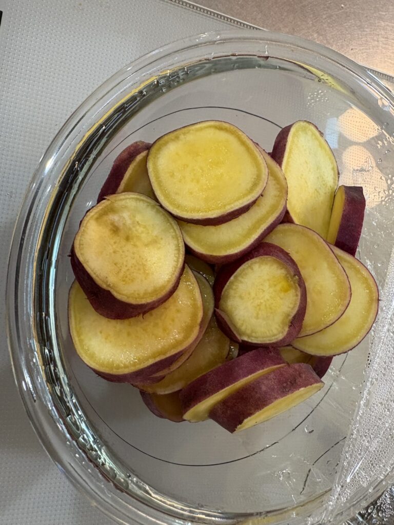 ①さつまいもを洗い、両端を切り落とした後に輪切りにする。耐熱ボールに入れてサッと水にさらした後、ふんわりラップをして電子レンジ600wで2〜3分加熱する。(我が家は茹で野菜モードを利用)