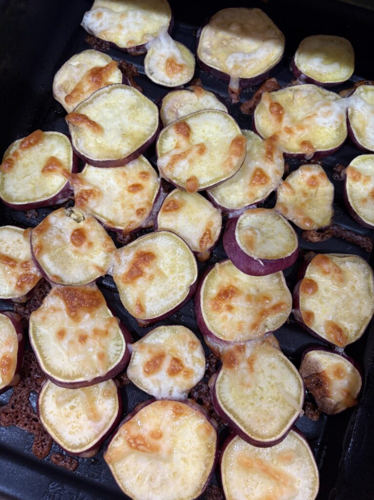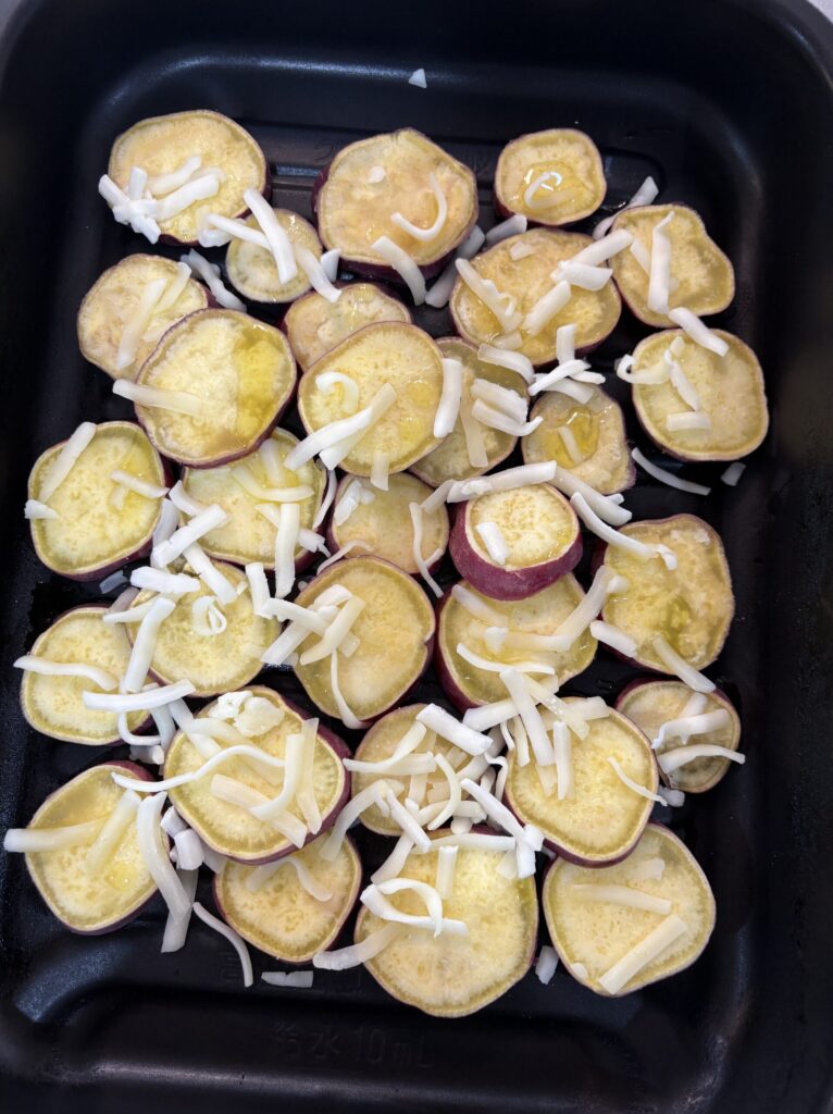 ②コンロ下のグリルプレートににさつまいもをできるだけ重ならない様に並べる。オリーブオイルを全体に満遍なくかける。最後にピザ用チーズをパラパラと全体に振りかける。(コンロ下のグリルがない場合はトースターなどでも良いです)20分ほど焼き、チーズがこんがりしてきたら完成です。