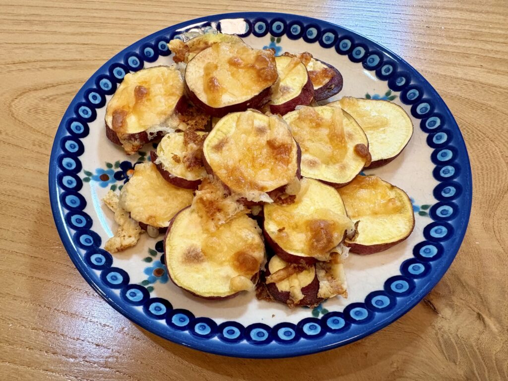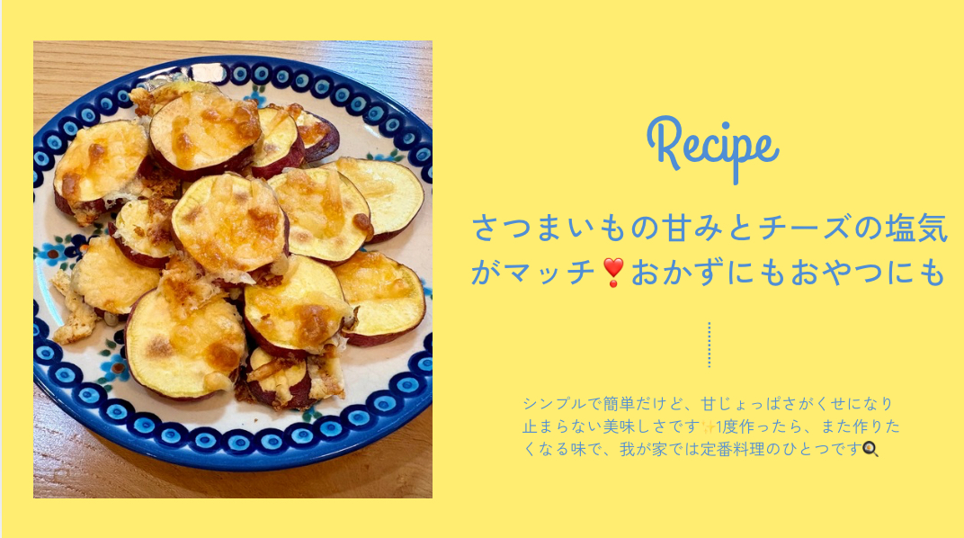このレシピのおいたちは、じゃがいものチーズ焼きを作る際にじゃがいもないため代わりにさつまいもを使用したところ、チーズの塩気とさつまいもの甘味がマッチしてとても美味しかったため、子どもにも好評で我が家の定番メニューになりました。材料が少なく、工程も少ないため気軽に作る事ができます。さつまいもの定番レシピに飽きてしまった時などにぜひ作ってみて欲しいです✨