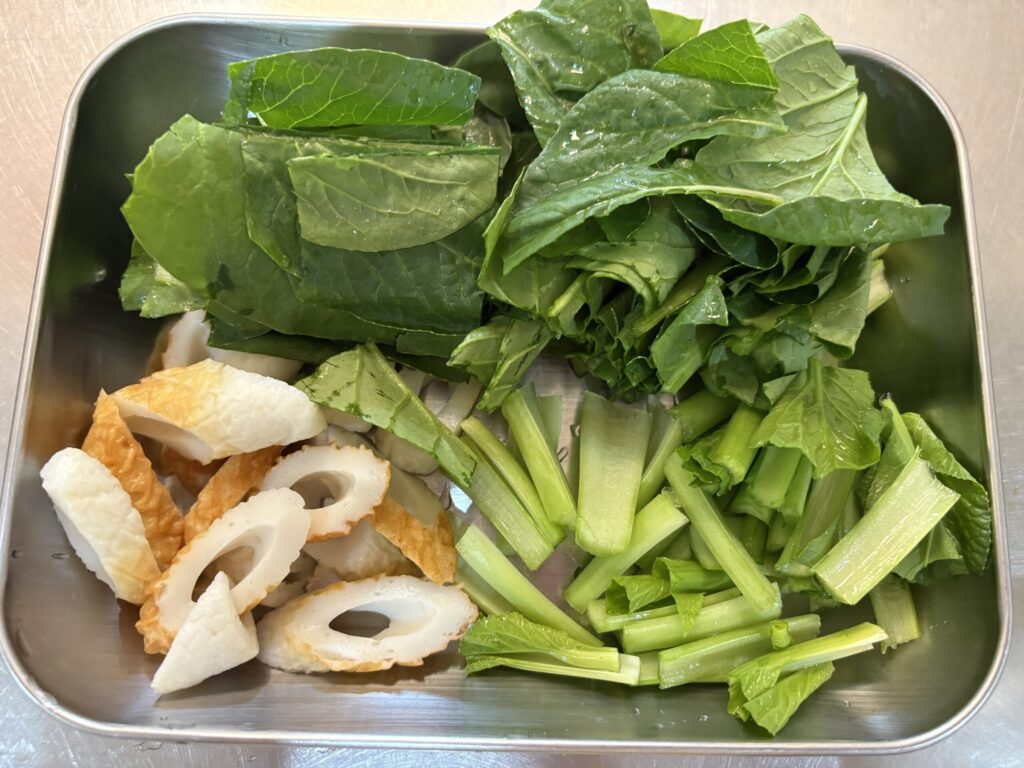 ①小松菜は根本の部分を切り落とし、3〜4センチ幅に切る。ちくわは斜め切りにしておく。