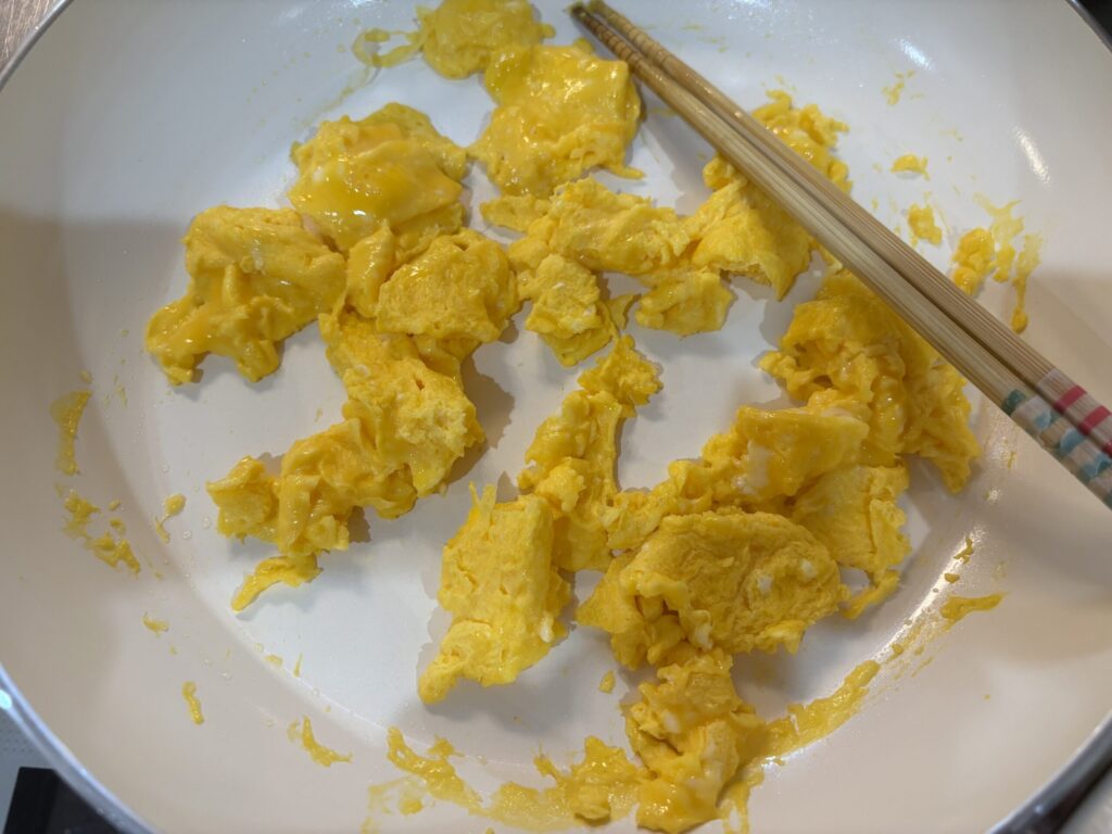 卵は後で他の具材と炒める際に少しバラバラになるため、ここでは細かくし過ぎない様に大きめのスクランブルエッグに仕上げておくと良い。細かすぎると食べにくくなってしまいます。
