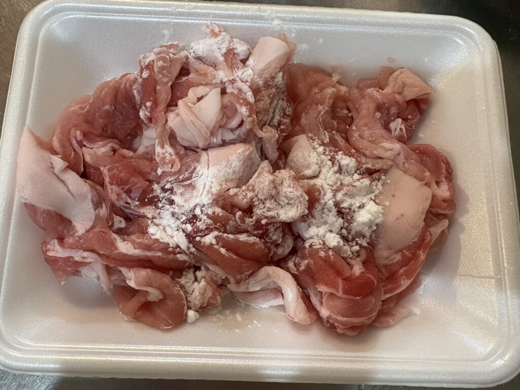 ③豚こま肉に片栗粉をまぶしておく。(大まかにで大丈夫です)