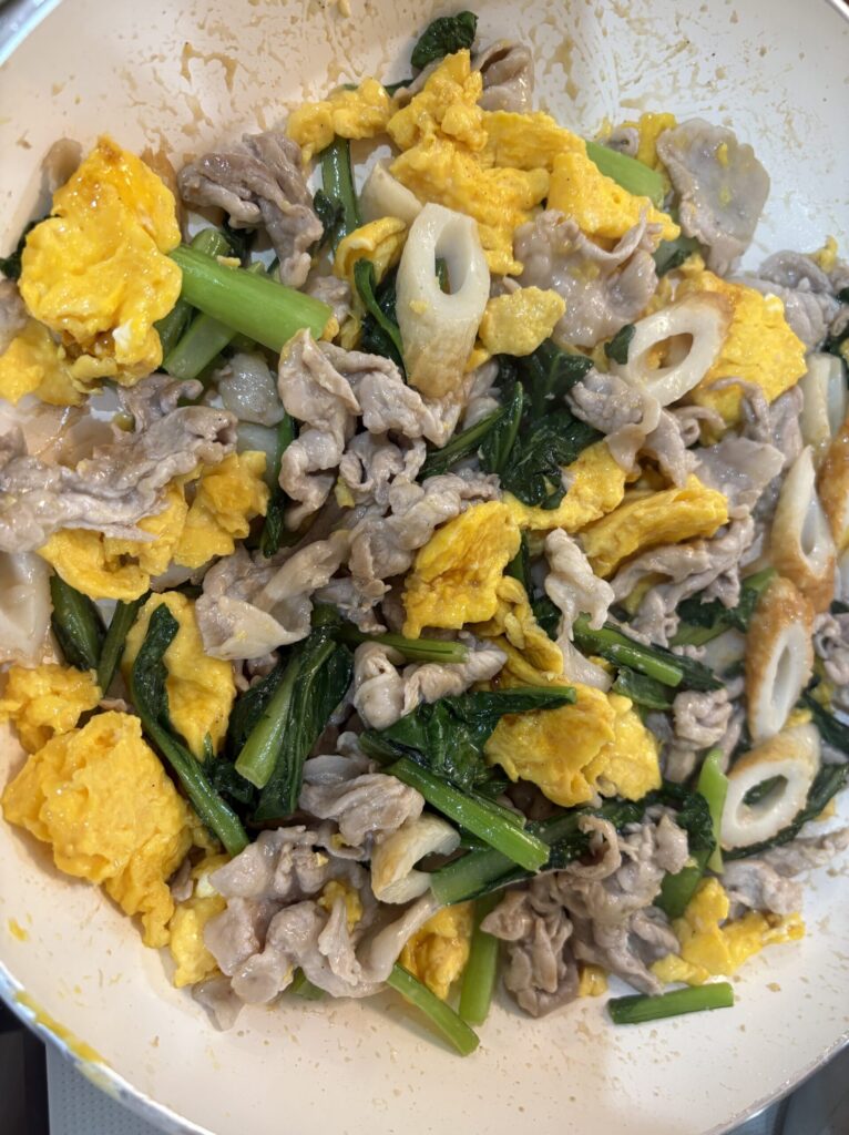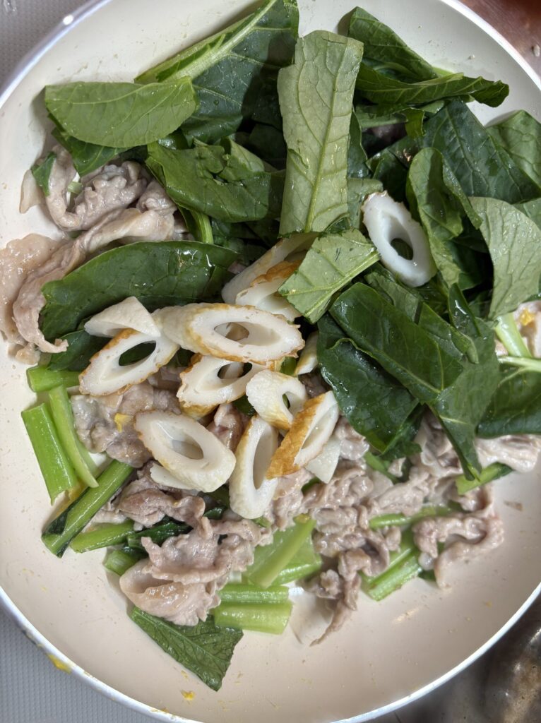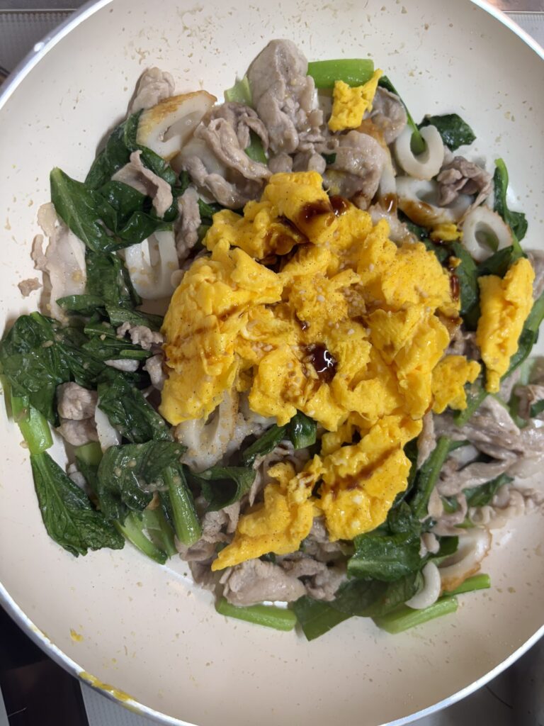 ④フライパンを熱してごま油を敷き、豚肉を入れて炒める。半分くらい白っぽくなってきたら塩コショウを加えて炒め、小松菜とちくわを加えてさらに炒める。