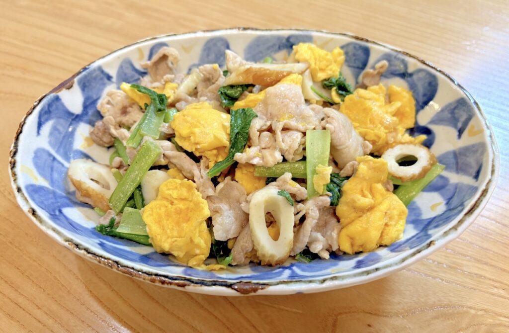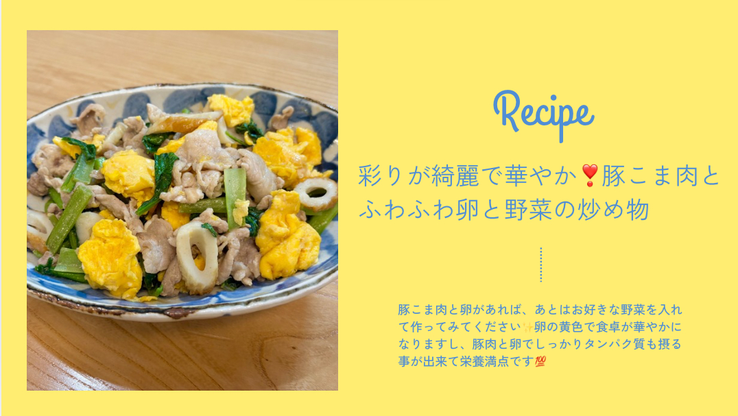 豚肉と卵、さらにちくわを加える事でたんぱく質をしっかり摂取することができ、栄養豊富な小松菜を組み合わせる事でカルシウムや鉄分なども合わせて摂ることができます✨食べ応えのあるおかずであるため、メインにも良いですが、味付けはあっさりしているため、あっさりした魚料理がメインの日の副菜としても良いと思います。卵の黄色が鮮やかで、こどもも喜んで食べてくれます👦💕ぜひ作ってみてくださいね❣️