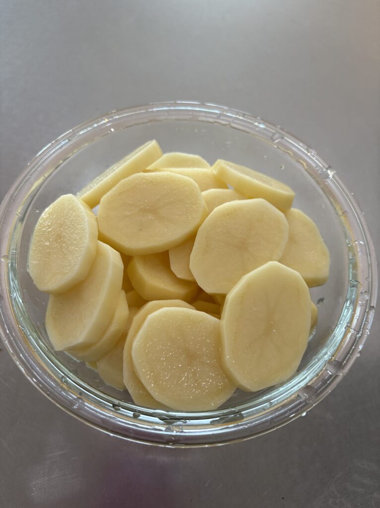 ①じゃがいもは皮がついたまま洗い、土などを洗い流す。その後皮をむき、4ミリ程の厚さで輪切りにする。