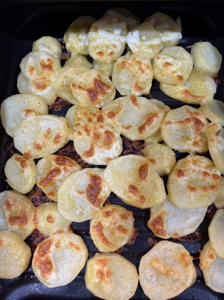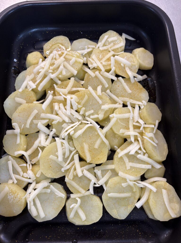 ③レンジで加熱したじゃがいもをコンロ下などにあるグリルプレートに出来るだけ重ならないように並べます。その後、オリーブオイルをじゃがいも全体に満遍なく回しかけます(かけ過ぎ注意)その後、ピザ用チーズをパラパラとかけて、カレー粉も全体に満遍なくかけます。グリルで20分程焼いて、チーズがこんがりしてきたら完成です!