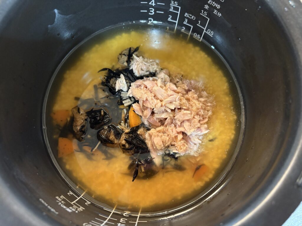 - 調味料とシーチキンを入れて炊くだけで、栄養満点の主食が完成。