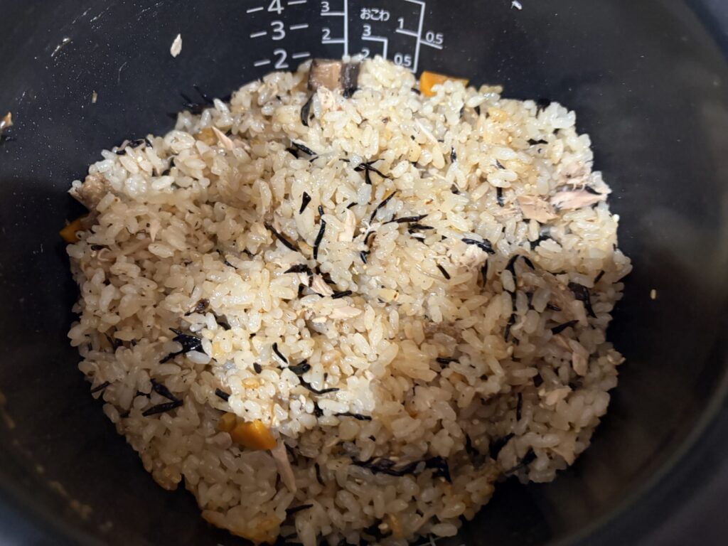 干し椎茸入りのひじき煮にシーチキンと調味料を加えて炊き込むだけで、手軽に栄養満点の炊き込みご飯が作れます。