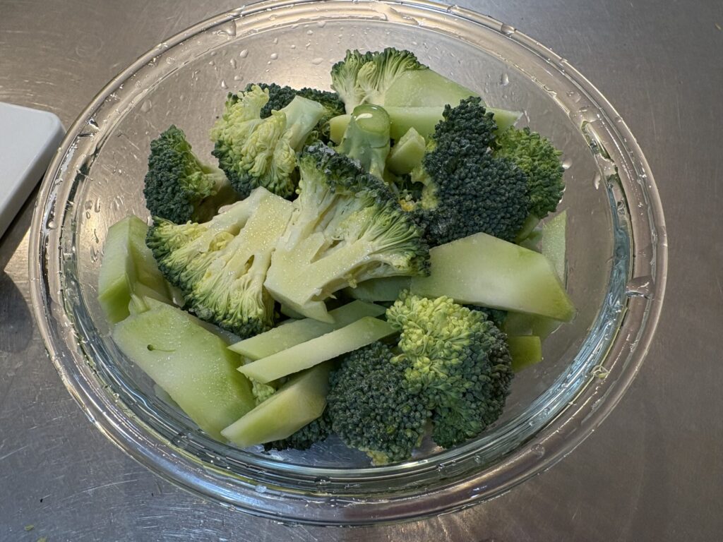 ①ブロッコリーは小房に分けて、芯の部分は周りの硬い部分だけ切り落とし、食べやすい大きさに切る。耐熱ボールに入れて、ブロッコリーを洗い、水を軽く切っておく。塩をごく少量手でつまみ、ブロッコリー全体にパラパラ振りかける。ラップをして電子レンジ600wで4分ほど加熱する。
