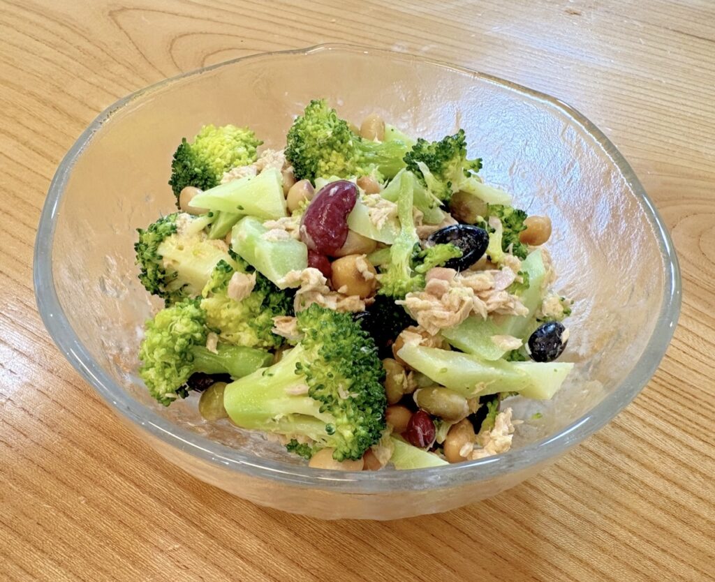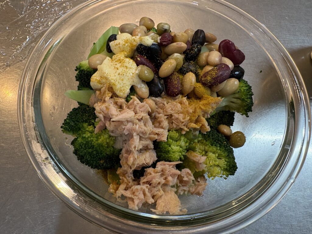 レンジ蒸しブロッコリーに、マルヤナギの蒸しサラダ豆、ツナ、少量マヨネーズ、カレー粉を合わせたサラダは、
