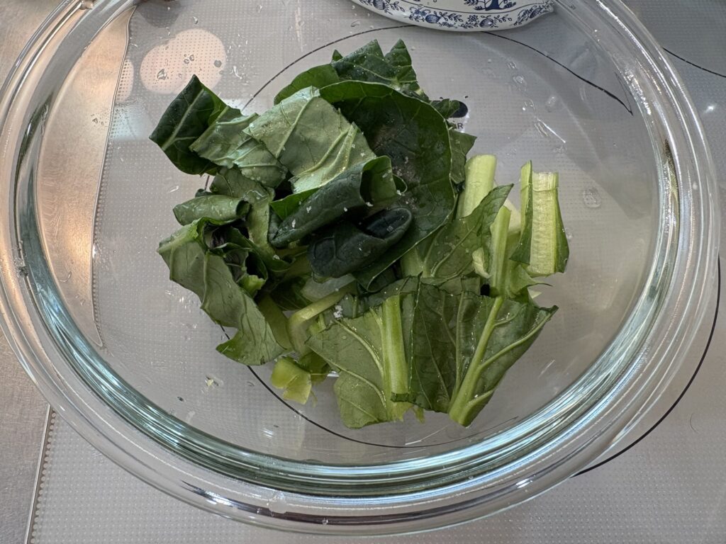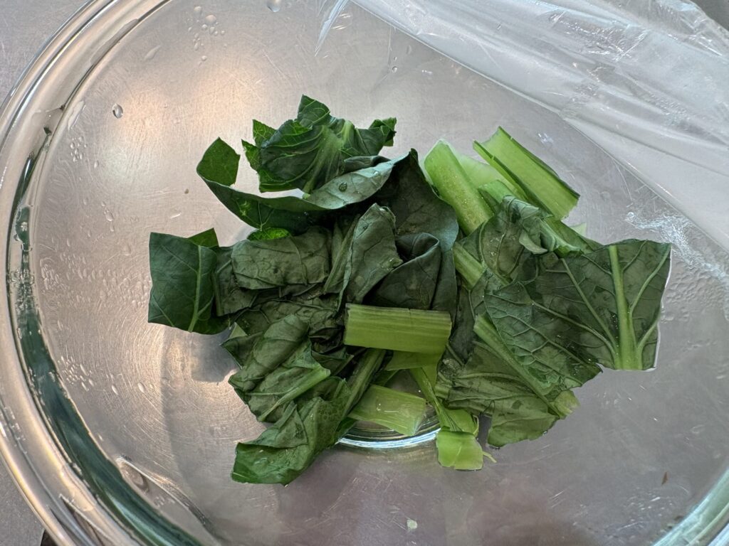 ②小松菜は3センチ幅くらいに切って耐熱容器に入れ、塩を極小量つまんでパラパラと振りかける。電子レンジ600w1分半加熱する。加熱後、水気を少し絞っておく。