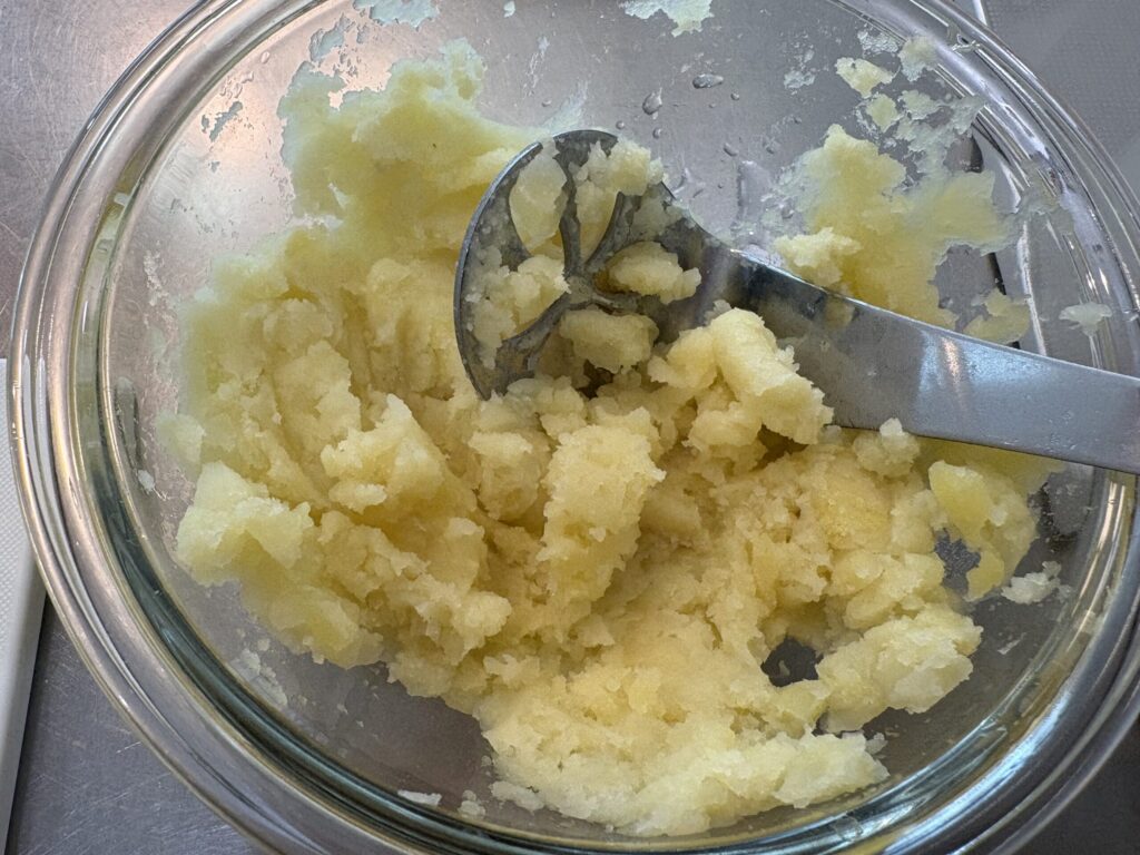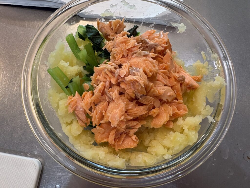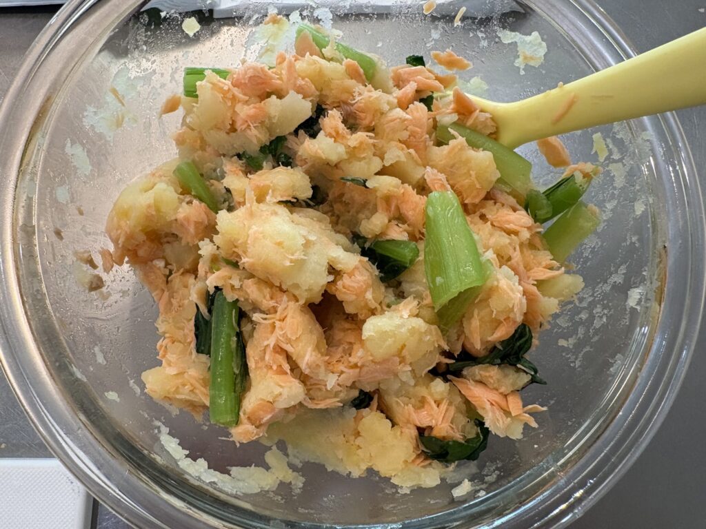 ③マッシュしたじゃがいもが温かいうちにバターを加え、ほぐした鮭、小松菜を加えて混ぜ合わせる。