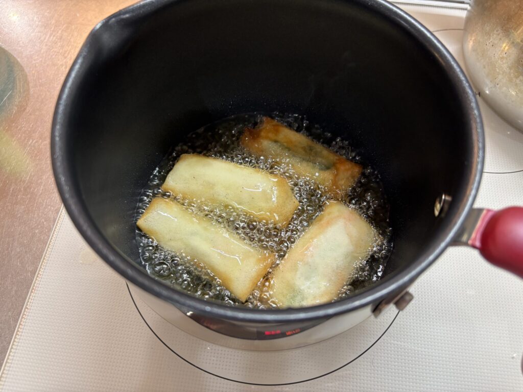 ⑤揚げ物用の鍋またはフライパンに油を注ぎ、180度くらいに温めてこんがりきつね色になるまで、途中で裏返しながら揚げたら完成です。