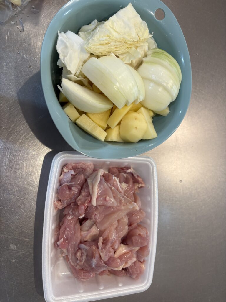 ①鶏肉は一口大に切る。玉ねぎはくし形切りにし、ジャガイモは皮をむき半分に切った後、1センチ程の厚さに切る(薄すぎると煮崩れしてしまいます)。きのこは食べやすい大きさに割くか切っておく。にんにくは皮をむき薄切りにする。