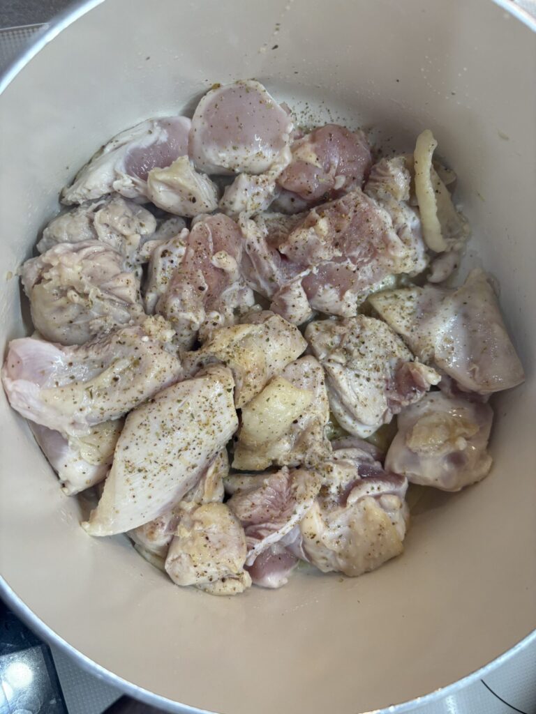 ②鍋を火にかけ(中火)、オリーブオイルを熱しにんにくを炒める。にんにくのいい香りがしてきたら、にんにくを鍋の端に寄せ鶏肉を並べ焼く。片面ずつうっすら白く色が変わる程度になったら、ハーブソルトで味付けをする。