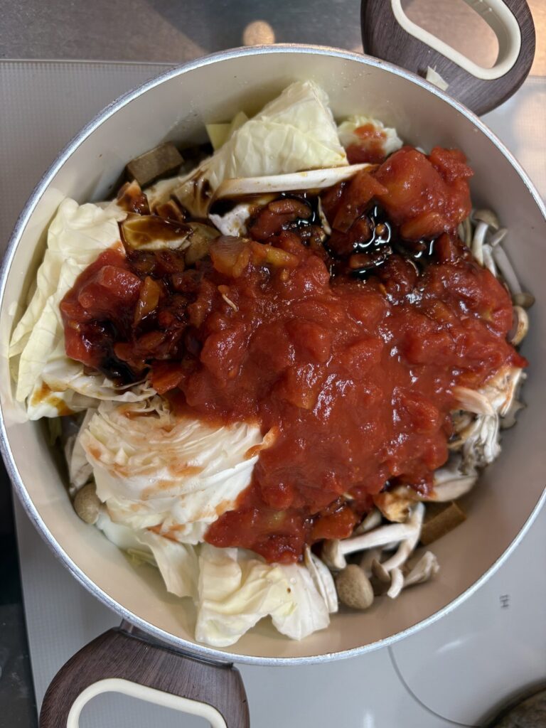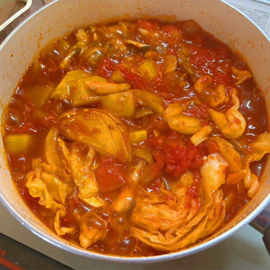 ③②に切った野菜ときのこを入れ、トマト缶と他の調味料を全て加える。トマト缶に少し残ったトマトは少量の水を缶に入れ、鍋に流し入れる。材料を全て入れたら、中火のまま蓋をして5分程煮込む。途中、調味料が全体に行き渡るように鍋を少し持ち上げて傾けたり、菜箸で具材が均等に鍋に収まるように整える。