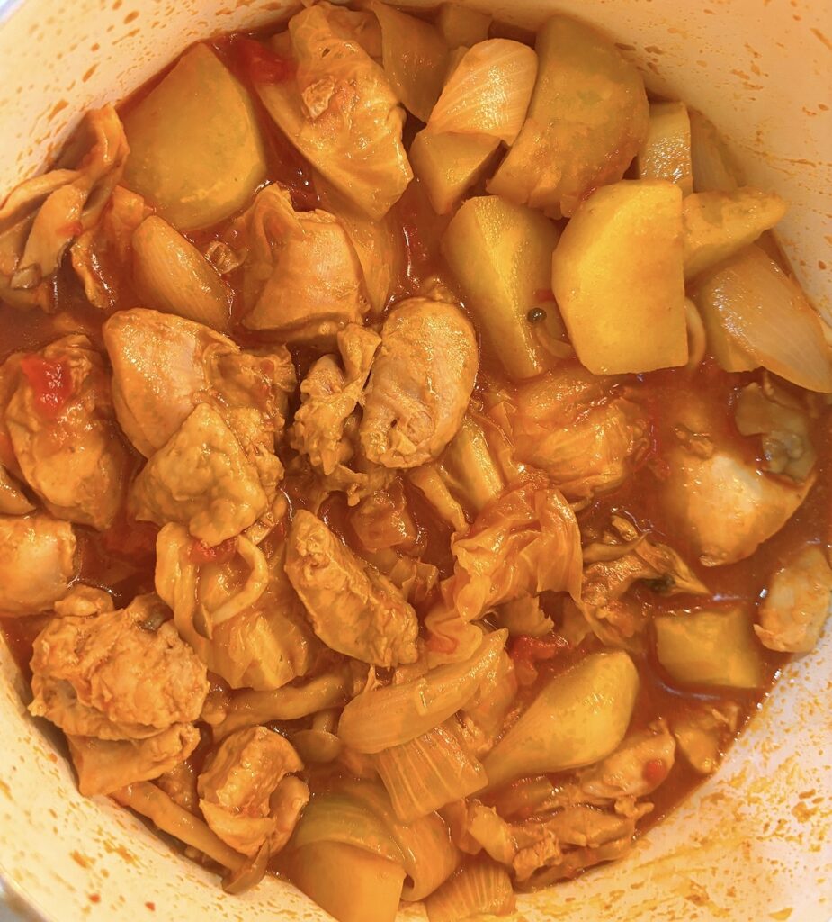 水分が蒸発して減り、ジャガイモが柔らかくなり始めた頃が出来上がりのサインです。パンや白ごはんと合わせてもいいですが、我が家では、ピラフと合わせて食べるのが好きです☺️🩷