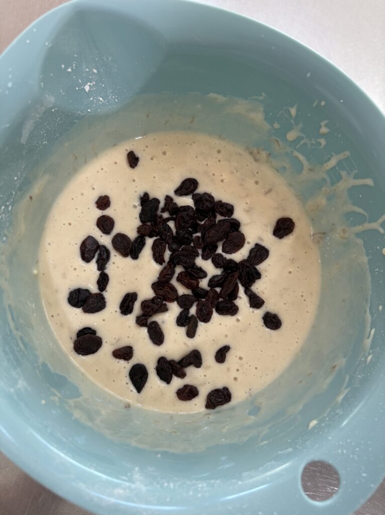 ②大きめのボールにホットケーキミックス、卵、牛乳、サラダ油を入れ泡立て器で混ぜる。全体が混ざって滑らかになったら、①のバナナを入れて混ぜ、レーズンも加え軽く混ぜる。