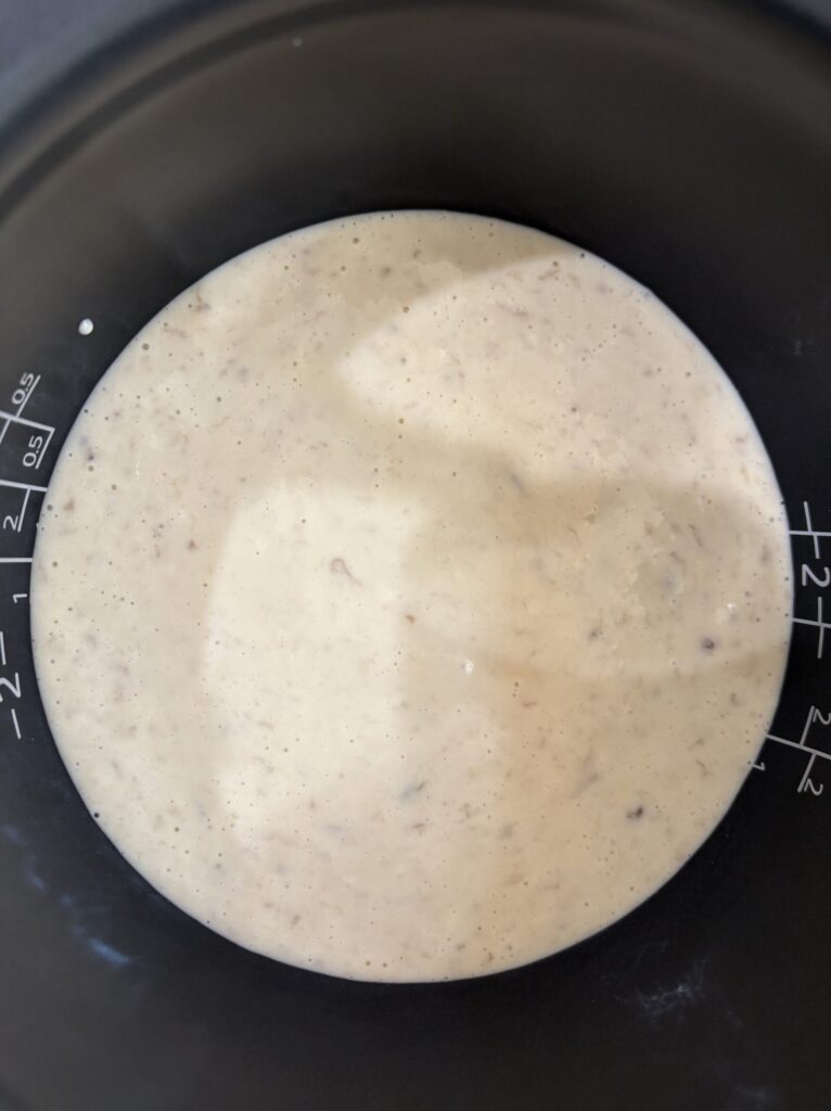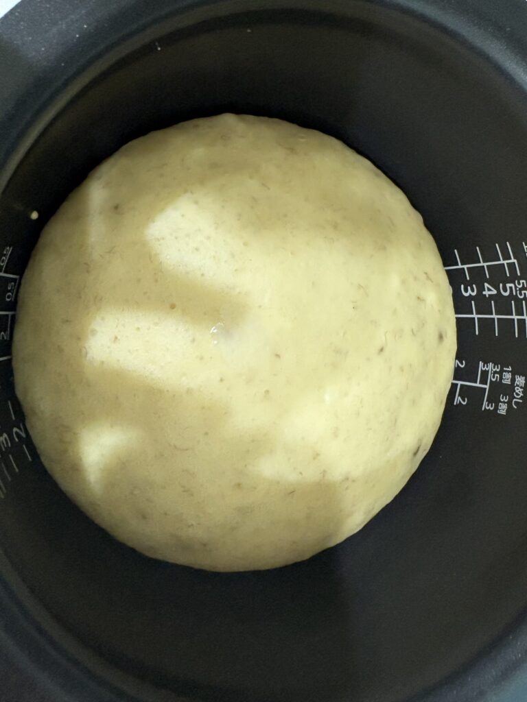 ③炊飯器にサラダ油を小さじ1入れて、キッチンペーパーなどで炊飯器の底を中心に油を伸ばしながら塗る。生地を流しこみ、調理モード又はケーキモードで45分加熱する。